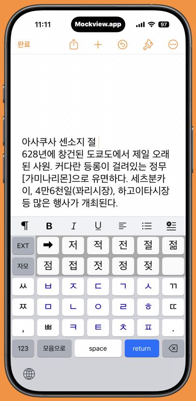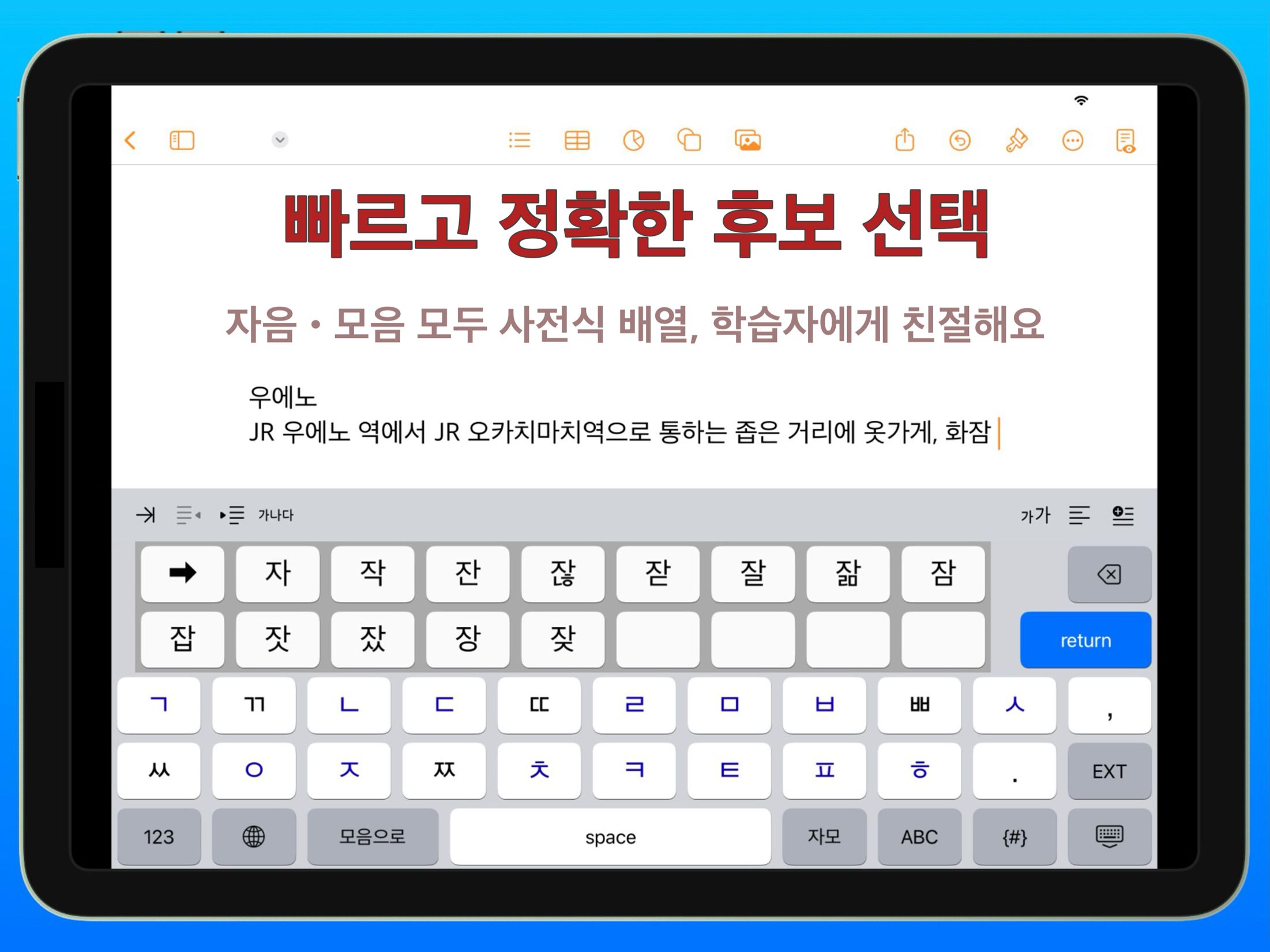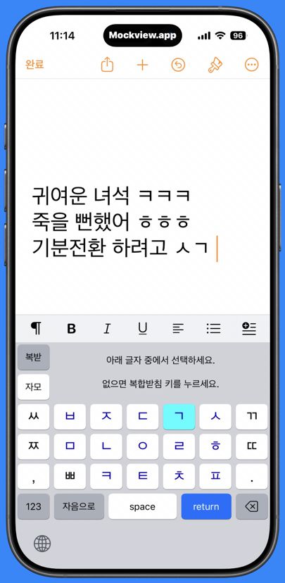 가끔은 자모만 입력하고 싶을 때가 있습니다. ㅋㅋㅋ(웃음), ㅎㅎㅎ(미소), 그리고 ㅅㄱ(수고) 같은 표현들입니다. 그럴 때는 ‘자모’ 키를 누르면 후보 영역에 안내 문구가 나타나며, 거기에서 원하는 자모를 탭하면 바로 입력됩니다.