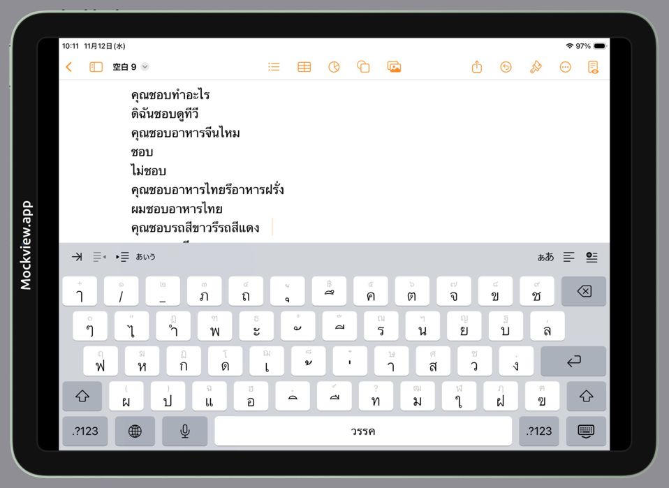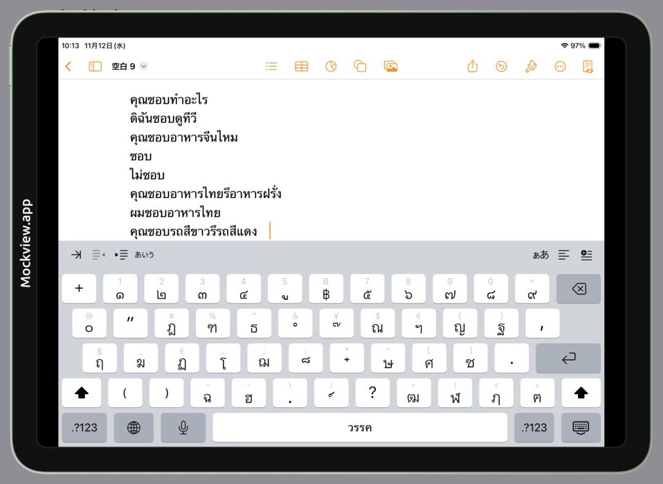 If you want to type Thai on your iPad while seeing as much of the screen as possible, try this: pinch the open area above the keyboard with two fingers. The keyboard will shrink to a smaller, iPhone-sized layout, just like in the image.