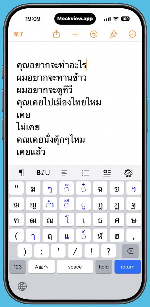 If you want to type multiple characters from the B-side in a row — for example, in the word ภาษาอังกฤษ (“English”), where you need to type the last two characters ฤ and ษ — press the “hold” key (located on the B-side) before tapping ฤ. When you do this, the keyboard will not return to the A-side after typing ฤ. After confirming that ฤ has been entered, tap the “hold” key again to turn off Hold Mode, then tap ษ. The character ษ will be entered, and the keyboard will automatically switch back to the A-side. It may seem complicated at first, but it becomes easy once you get used to it.